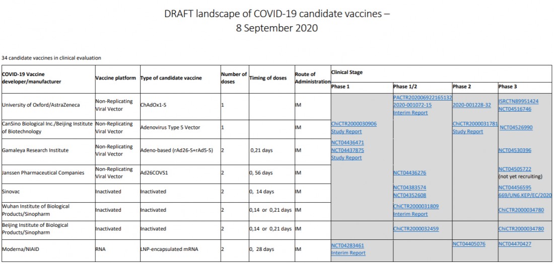 세계보건기구(WHO)의 8일 자료에 따르면 현재 세계에서 34종의 백신 후보물질이 개발 중이고 그 가운데 최소 8종이 3상에 들어갔다. 아스트라제네카는 미국에서 3만명의 자원자를 대상으로 시험 중이었고, 백신 개발 호재로 주가가 치솟은 미국 모더나도 역시 3만명을 대상으로 7월 27일부터 시험을 시작했다. 바이오엔테크와 화이자가 공동개발한 백신도 같은 날부터 시험에 들어갔으며 10월 중 결과가 나올 것을 기대하고 있다.